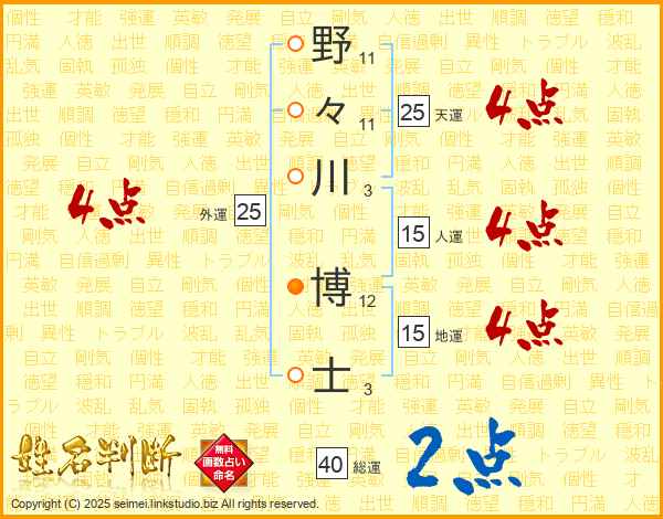 野(11画)々(11画)川(3画) 博(12画)士(3画)