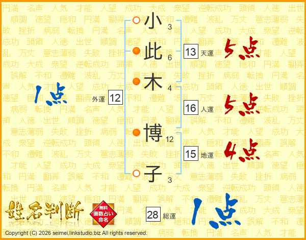 小(3画)此(6画)木(4画) 博(12画)子(3画)