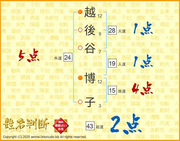 越(12画)後(9画)谷(7画) 博(12画)子(3画)