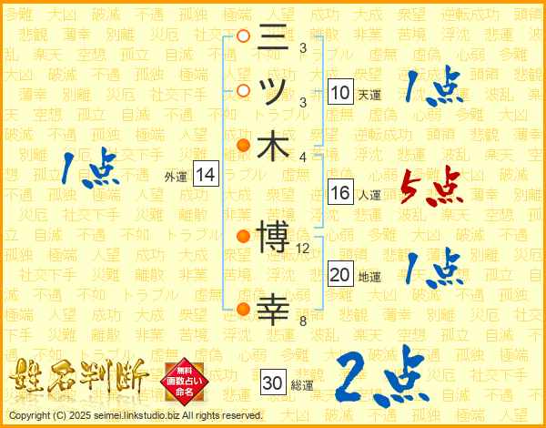 三(3画)ツ(3画)木(4画) 博(12画)幸(8画)