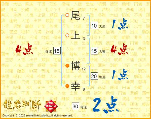 尾(7画)上(3画) 博(12画)幸(8画)