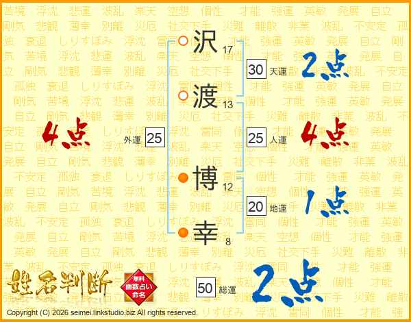 沢(17画)渡(13画) 博(12画)幸(8画)