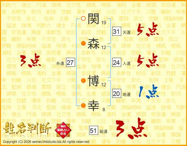 生活面を象徴する運勢です。外部から受ける影響力を表し、結婚運、家庭運や職場、環境への順応性を表します。総運から人運を引いた画数。姓や名が1文字の場合を除く。