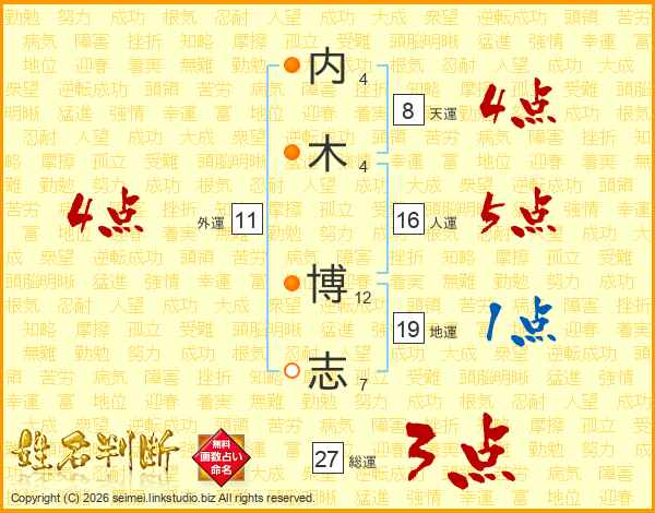内(4画)木(4画) 博(12画)志(7画)