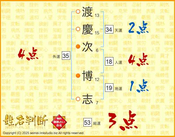 渡(13画)慶(15画)次(6画) 博(12画)志(7画)