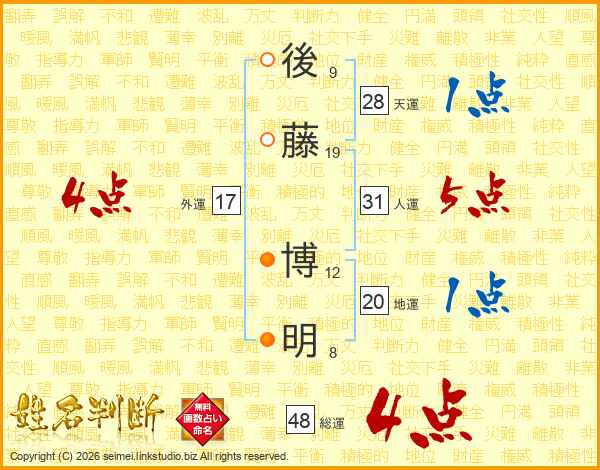 生活面を象徴する運勢です。外部から受ける影響力を表し、結婚運、家庭運や職場、環境への順応性を表します。総運から人運を引いた画数。姓や名が1文字の場合を除く。