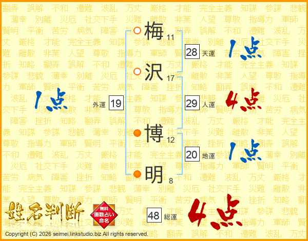 あなたの人生を表す1番重要な運勢です。生涯を通じて影響する総合運となり、主に50歳以降の晩年期に影響を及ぼします。苗字と名前の合計画数。