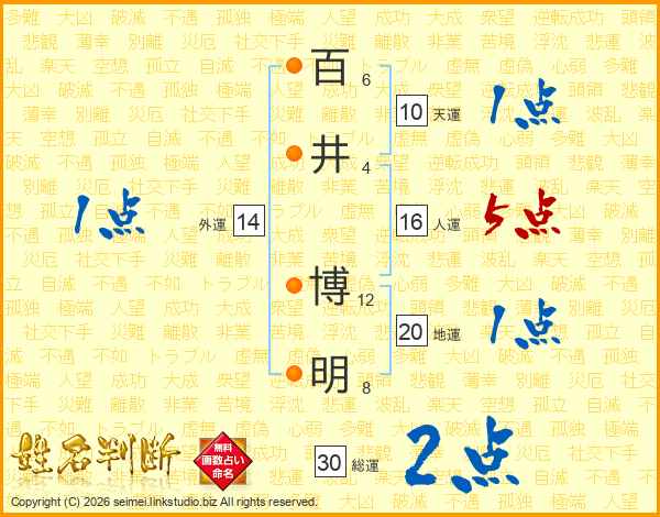 あなたの人生を表す1番重要な運勢です。生涯を通じて影響する総合運となり、主に50歳以降の晩年期に影響を及ぼします。苗字と名前の合計画数。