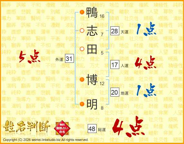 鴨(16画)志(7画)田(5画) 博(12画)明(8画)