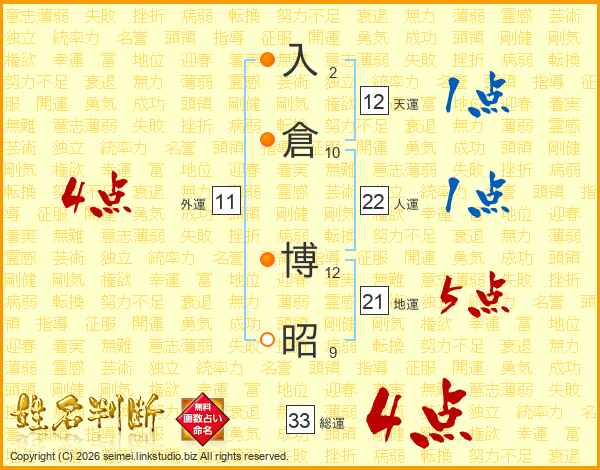 入倉博昭さんの総運は33画の4点!
