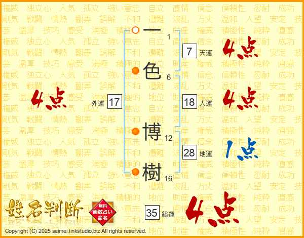 あなたの人生を表す1番重要な運勢です。生涯を通じて影響する総合運となり、主に50歳以降の晩年期に影響を及ぼします。苗字と名前の合計画数。