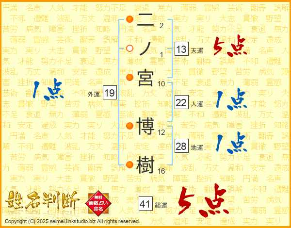 二(2画)ノ(1画)宮(10画) 博(12画)樹(16画)