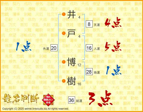あなたの人生を表す1番重要な運勢です。生涯を通じて影響する総合運となり、主に50歳以降の晩年期に影響を及ぼします。苗字と名前の合計画数。