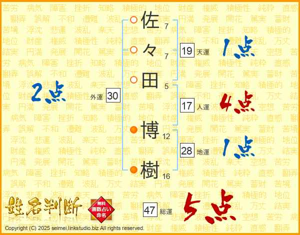 佐(7画)々(7画)田(5画) 博(12画)樹(16画)