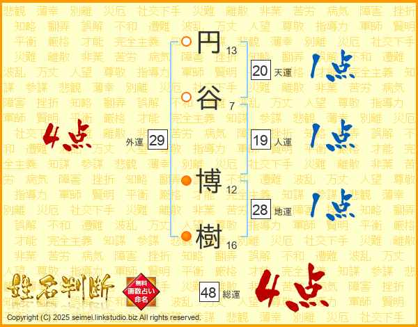 あなたの人生を表す1番重要な運勢です。生涯を通じて影響する総合運となり、主に50歳以降の晩年期に影響を及ぼします。苗字と名前の合計画数。