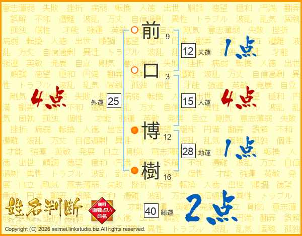 生活面を象徴する運勢です。外部から受ける影響力を表し、結婚運、家庭運や職場、環境への順応性を表します。総運から人運を引いた画数。姓や名が1文字の場合を除く。