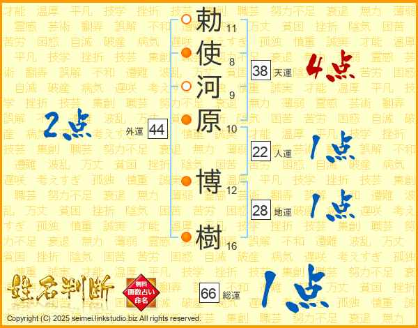 勅(11画)使(8画)河(9画)原(10画) 博(12画)樹(16画)