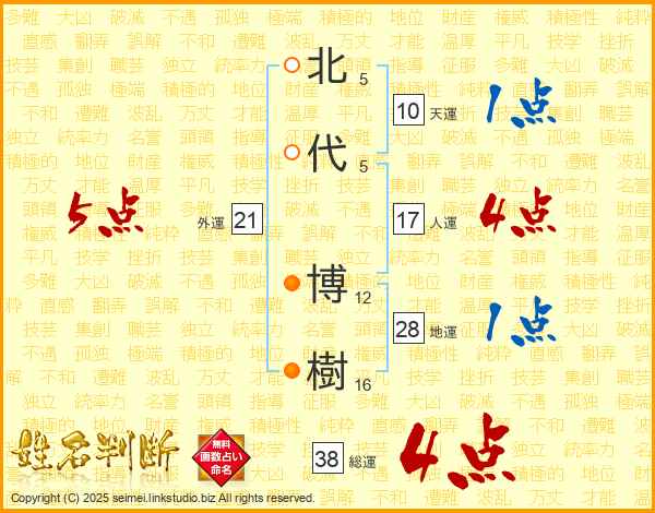 あなたの人生を表す1番重要な運勢です。生涯を通じて影響する総合運となり、主に50歳以降の晩年期に影響を及ぼします。苗字と名前の合計画数。