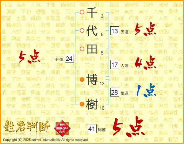 千(3画)代(5画)田(5画) 博(12画)樹(16画)