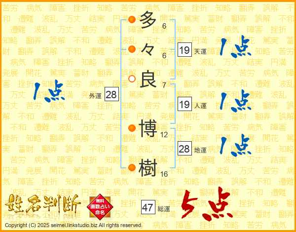 多(6画)々(6画)良(7画) 博(12画)樹(16画)