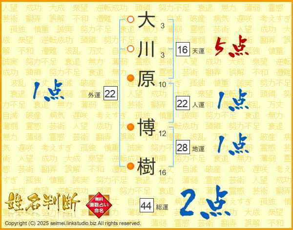 大(3画)川(3画)原(10画) 博(12画)樹(16画)