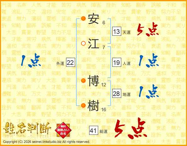 あなたの人生を表す1番重要な運勢です。生涯を通じて影響する総合運となり、主に50歳以降の晩年期に影響を及ぼします。苗字と名前の合計画数。