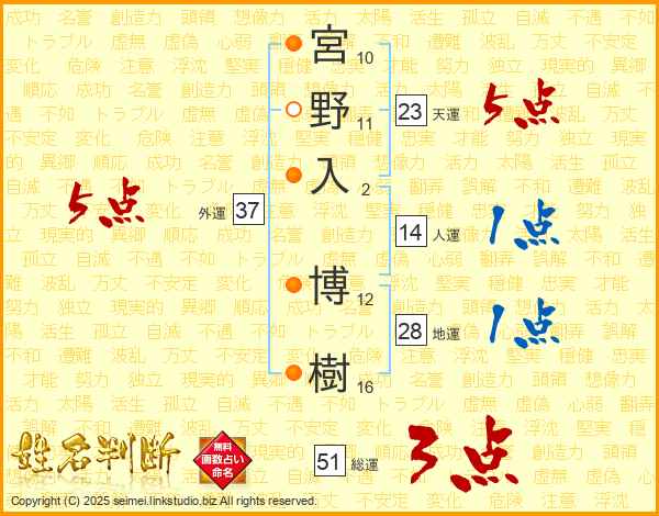 宮(10画)野(11画)入(2画) 博(12画)樹(16画)