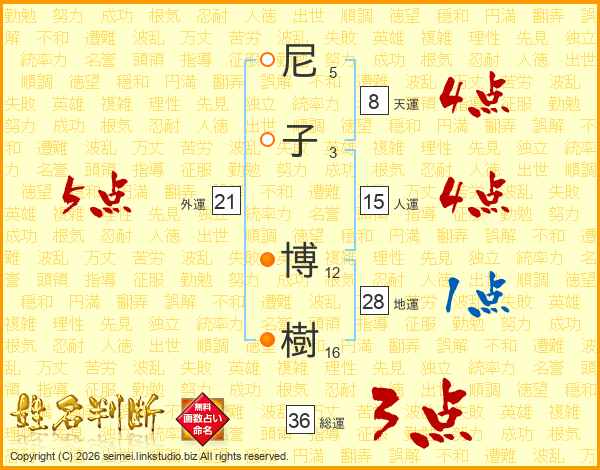 生活面を象徴する運勢です。外部から受ける影響力を表し、結婚運、家庭運や職場、環境への順応性を表します。総運から人運を引いた画数。姓や名が1文字の場合を除く。
