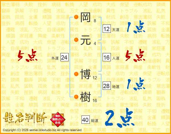あなたの人生を表す1番重要な運勢です。生涯を通じて影響する総合運となり、主に50歳以降の晩年期に影響を及ぼします。苗字と名前の合計画数。