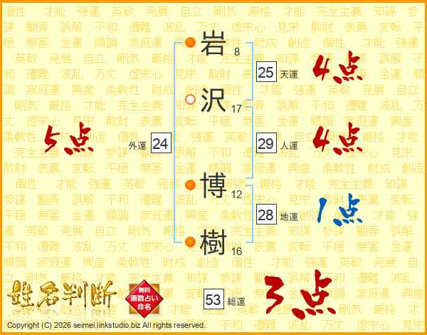 岩(8画)沢(17画) 博(12画)樹(16画)