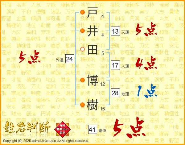 戸(4画)井(4画)田(5画) 博(12画)樹(16画)