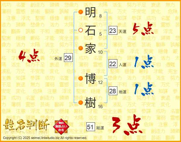 明(8画)石(5画)家(10画) 博(12画)樹(16画)