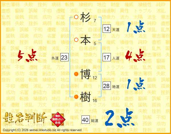あなたの人生を表す1番重要な運勢です。生涯を通じて影響する総合運となり、主に50歳以降の晩年期に影響を及ぼします。苗字と名前の合計画数。