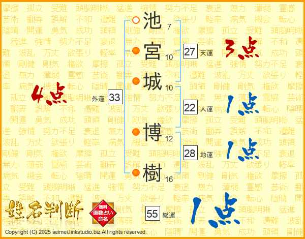 池(7画)宮(10画)城(10画) 博(12画)樹(16画)