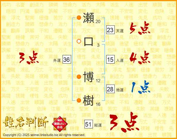 瀬(20画)口(3画) 博(12画)樹(16画)