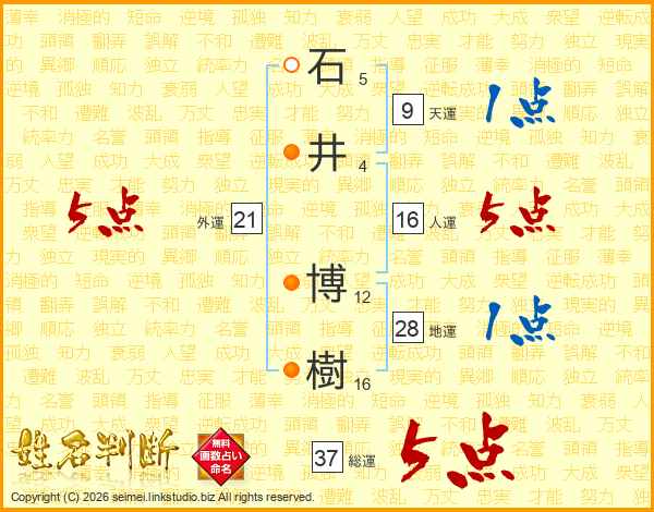 石(5画)井(4画) 博(12画)樹(16画)