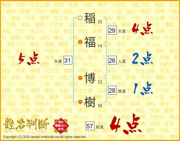 生活面を象徴する運勢です。外部から受ける影響力を表し、結婚運、家庭運や職場、環境への順応性を表します。総運から人運を引いた画数。姓や名が1文字の場合を除く。
