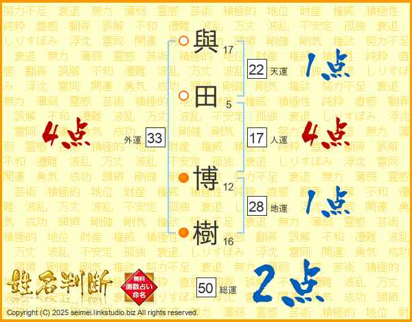 生活面を象徴する運勢です。外部から受ける影響力を表し、結婚運、家庭運や職場、環境への順応性を表します。総運から人運を引いた画数。姓や名が1文字の場合を除く。