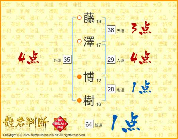 藤(19画)澤(17画) 博(12画)樹(16画)