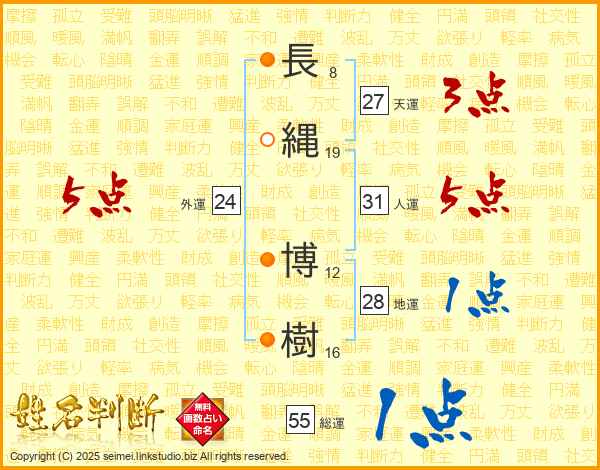 あなたの人生を表す1番重要な運勢です。生涯を通じて影響する総合運となり、主に50歳以降の晩年期に影響を及ぼします。苗字と名前の合計画数。