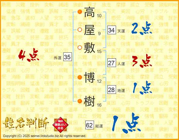 高(10画)屋(9画)敷(15画) 博(12画)樹(16画)