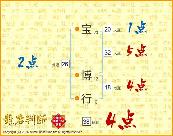 生活面を象徴する運勢です。外部から受ける影響力を表し、結婚運、家庭運や職場、環境への順応性を表します。総運から人運を引いた画数。姓や名が1文字の場合を除く。