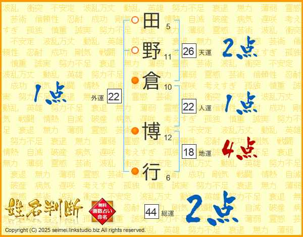 田(5画)野(11画)倉(10画) 博(12画)行(6画)