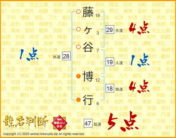 藤(19画)ヶ(3画)谷(7画) 博(12画)行(6画)