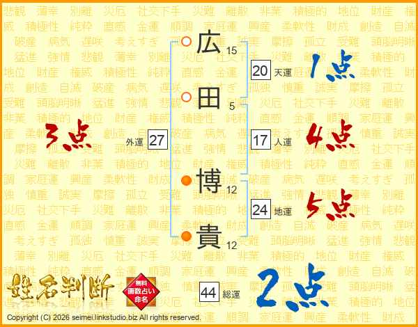 広(15画)田(5画) 博(12画)貴(12画)