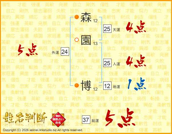 生活面を象徴する運勢です。外部から受ける影響力を表し、結婚運、家庭運や職場、環境への順応性を表します。総運から人運を引いた画数。姓や名が1文字の場合を除く。