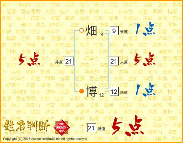 生活面を象徴する運勢です。外部から受ける影響力を表し、結婚運、家庭運や職場、環境への順応性を表します。総運から人運を引いた画数。姓や名が1文字の場合を除く。