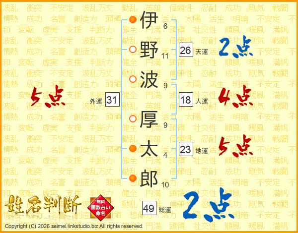伊野波厚太郎さんの総運は49画の2点!
