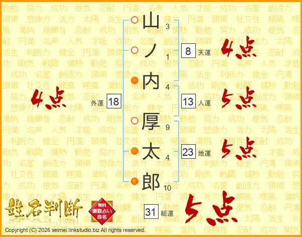 山(3画)ノ(1画)内(4画) 厚(9画)太(4画)郎(10画)