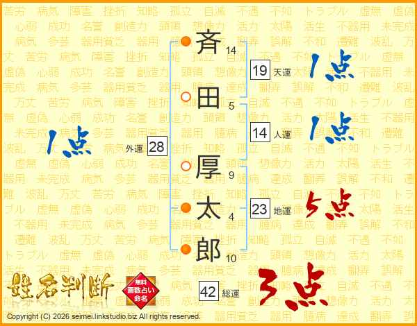 斉田厚太郎さんの総運は42画の3点!